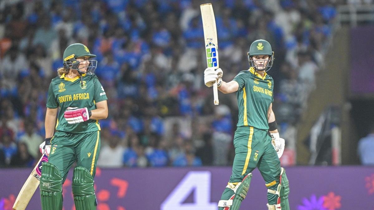 रविवार को नवी मुंबई के डीवाई पाटिल स्टेडियम में भारत बनाम दक्षिण अफ्रीका के आईसीसी महिला विश्व कप फाइनल मैच के दौरान दक्षिण अफ्रीका की कप्तान लॉरा वोल्वार्ड्ट ने अपने पचास रन का जश्न मनाया। | फोटो साभार: इमैन्युअल योगिनी