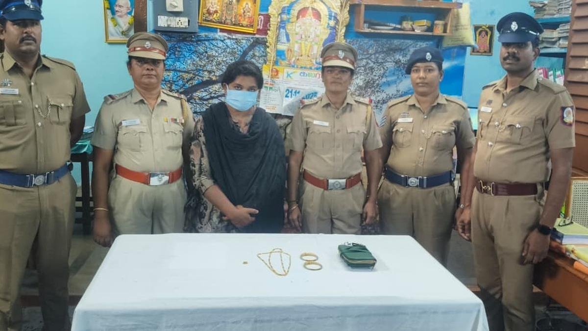 वेल्लोर के काटपाडी रेलवे स्टेशन पर एक यात्री से 13 सोने के आभूषण चुराने के आरोप में शनिवार को सरकारी रेलवे पुलिस (जीआरपी) ने एक 45 वर्षीय महिला को गिरफ्तार किया।