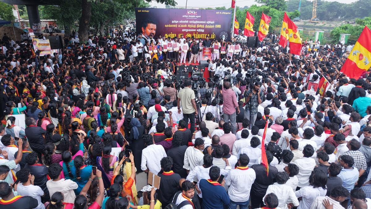 तमिलनाडु में मतदाता सूची के भारत निर्वाचन आयोग के चल रहे विशेष गहन पुनरीक्षण (एसआईआर) पर आपत्ति जताते हुए तमिलागा वेट्री कज़गम (टीवीके) ने रविवार को राज्यव्यापी प्रदर्शन किया।