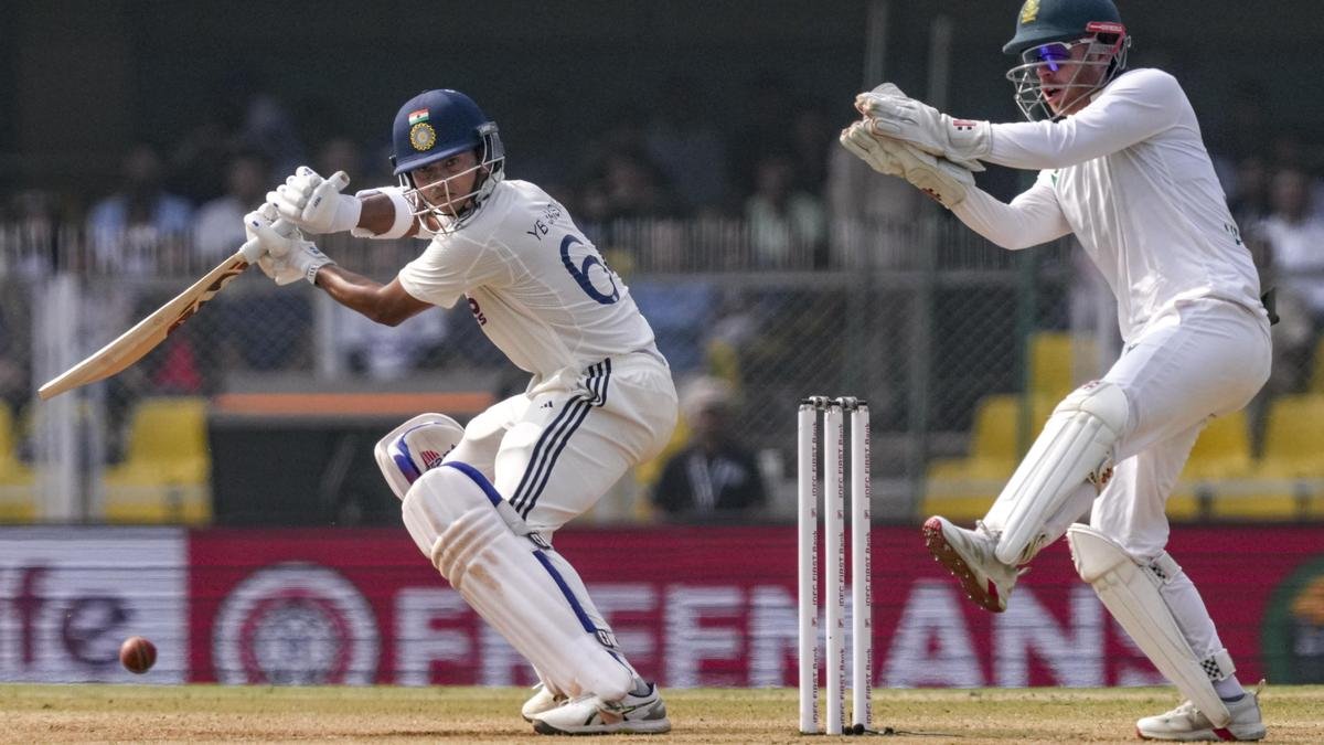 यशस्वी जयसवाल 24 नवंबर, 2025 को गुवाहाटी के एसीए स्टेडियम में भारत और दक्षिण अफ्रीका के बीच दूसरे टेस्ट क्रिकेट मैच के तीसरे दिन शॉट खेलते हुए। फोटो साभार: पीटीआई