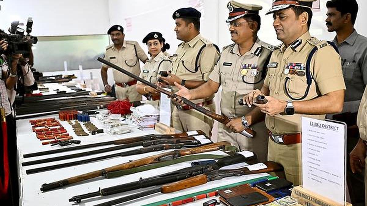 आंध्र प्रदेश के एडीजीपी-इंटेलिजेंस महेश चंद्र लड्ढा, एलुरु रेंज के महानिरीक्षक जीवीजी अशोक कुमार और विजयवाड़ा में अन्य पुलिस अधिकारी गिरफ्तार माओवादियों से जब्त हथियारों का निरीक्षण करते हैं। | फोटो साभार: द हिंदू