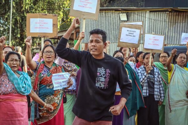 मणिपुर अखंडता पर समन्वय समिति के तत्वावधान में आंतरिक रूप से विस्थापित व्यक्तियों और व्यक्तियों ने 21 नवंबर, 2025 को इंफाल पूर्व में संगाई महोत्सव 2025 संस्करण के उद्घाटन दिवस पर पुनर्वास की मांग करते हुए विरोध प्रदर्शन किया। फोटो साभार: एएनआई अधिकारियों ने कहा कि यहां राहत शिविरों में रह रहे सैकड़ों आंतरिक रूप…
