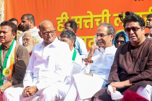 बाएं से दाएं: 1 नवंबर, 2025 को मुंबई में मतदाता सूची पंजीकरण पर कथित चुनाव आयोग की निष्क्रियता के खिलाफ विरोध प्रदर्शन के दौरान एनसीपी (एससीपी) प्रमुख शरद पवार, शिवसेना (यूबीटी) प्रमुख उद्धव ठाकरे और महाराष्ट्र नवनिर्माण सेना (एमएनएस) प्रमुख राज ठाकरे। फोटो साभार: एएनआई गठबंधन संयोजनों में बदलाव की संभावना को लेकर महाराष्ट्र में…