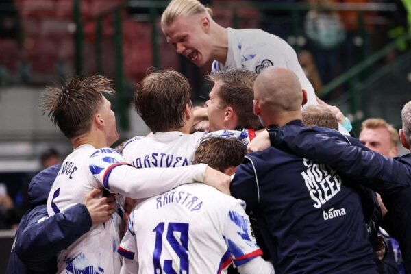 16 नवंबर, 2025 को मिलान, इटली में विश्व कप क्वालीफायर के ग्रुप I मैच में जोर्गेन स्ट्रैंड लार्सन द्वारा इटली के खिलाफ अपना चौथा गोल करने के बाद नॉर्वे के एर्लिंग हालैंड और टीम के साथी जश्न मनाते हुए। फोटो साभार: रॉयटर्स नॉर्वे ने 1998 के बाद अपने पहले विश्व कप के लिए क्वालीफाई किया,…